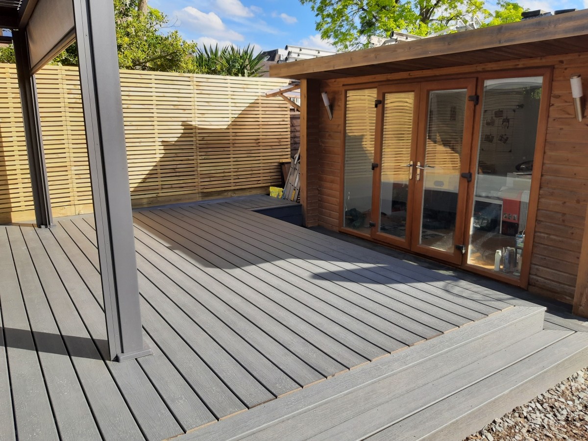 The original brief was to retain the 4-5 rows of timber Decking in front of the Summerhouse doors, however we decided to replace them instead for a consistent appearance. It would also be very difficult to replace them in the future without damaging either the new Trex Decking or the Summerhouse itself.