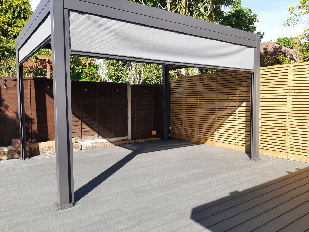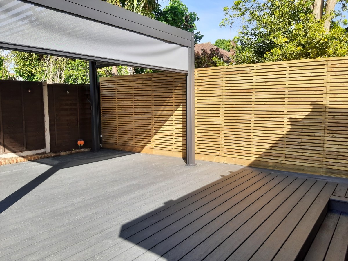This project had a crystal clear vision from the start. The clients knew exactly what they wanted. Slat Screen Fencing at the rear of the property, composite decking to replace their old Decking area, a wraparound step from the garden and Summerhouse, and a raised bed. It would be finished with an Aluminium Pergola.