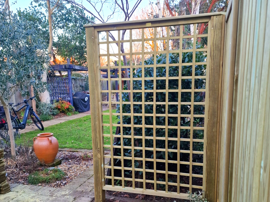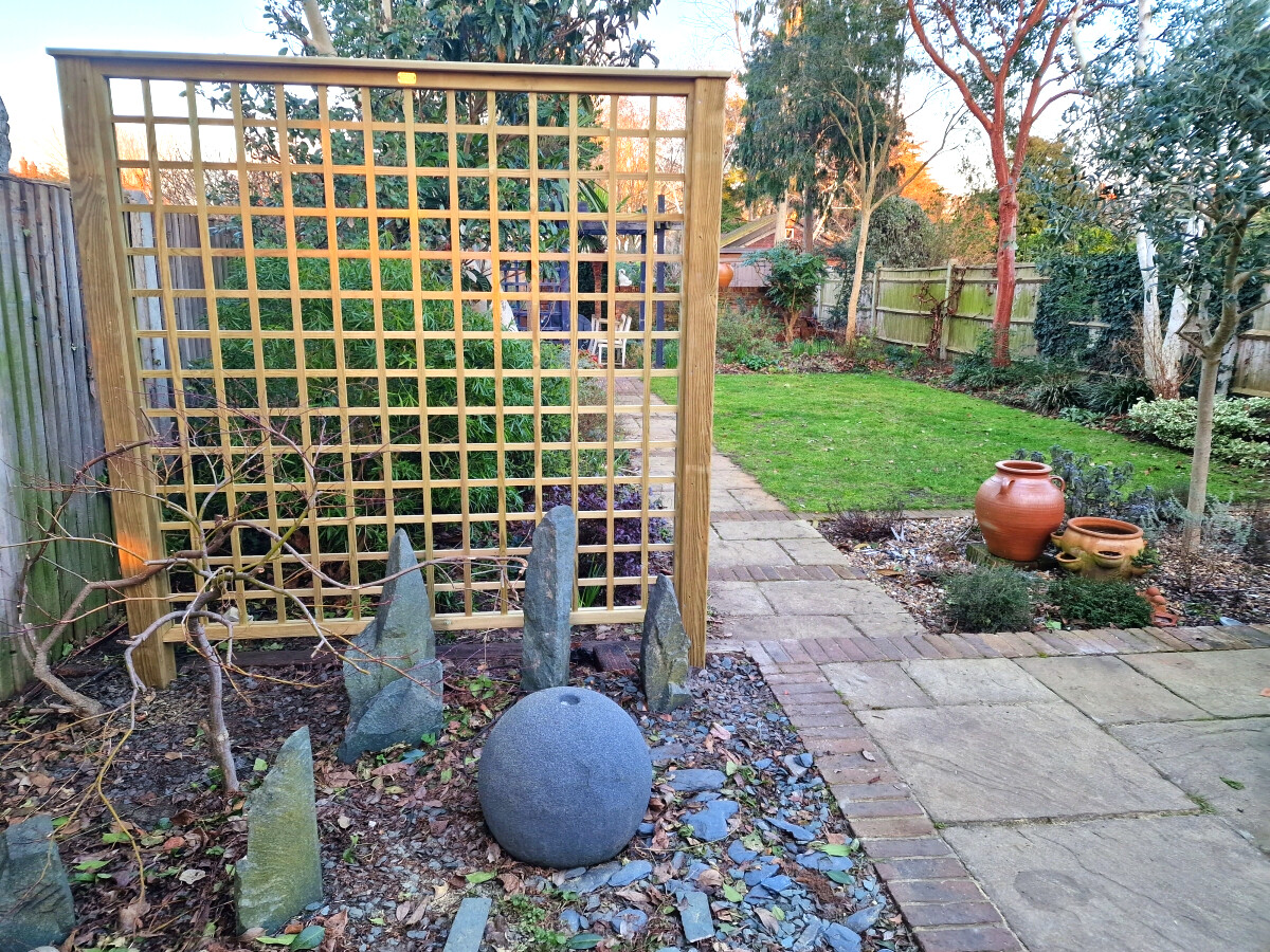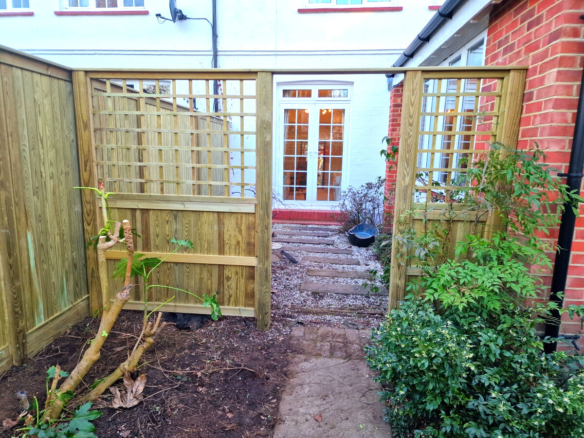 For this fence install in Wimbledon SW19, the client had a crystal clear plan for what they wanted. The large sized garden was already separated in 4-5 sections through various methods. Combining Trellis and Low Level Fence panels separated the smaller side section 1 and 2 and full Trellis panels separated the paved area of section 2 with the lawn area of 3.