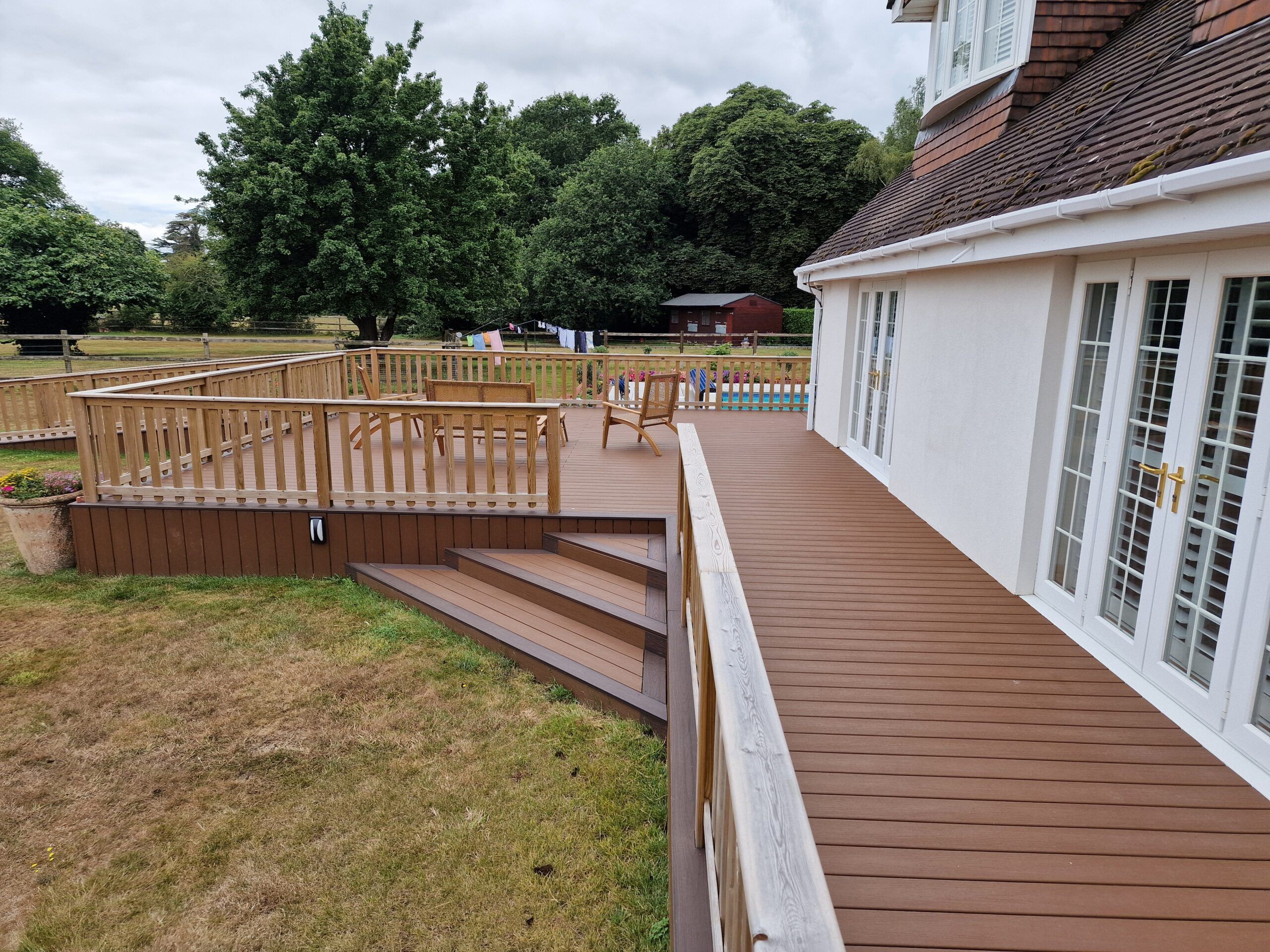 This large project included 185 square metres of Trex Composite Decking, 85 linear metres of Ballustrades, over 100 lights, 3 staircases, and 2 Ramps and wrapped the deck all the way around this beautiful home in the Arundel countryside of West Sussex.
