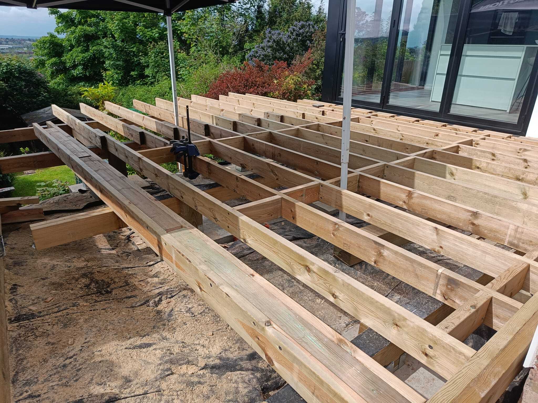 The we built out frame on top of these 3 bearer rows. The frame is also C24 Structurally Rated timber treated to Use Class 4, the strongest rating available for Residential installs. Use Class 4 Timber has the highest rating for Preservative treatment for Residential installs meaning it is highly resistant to Wood Rot and Insect attack.