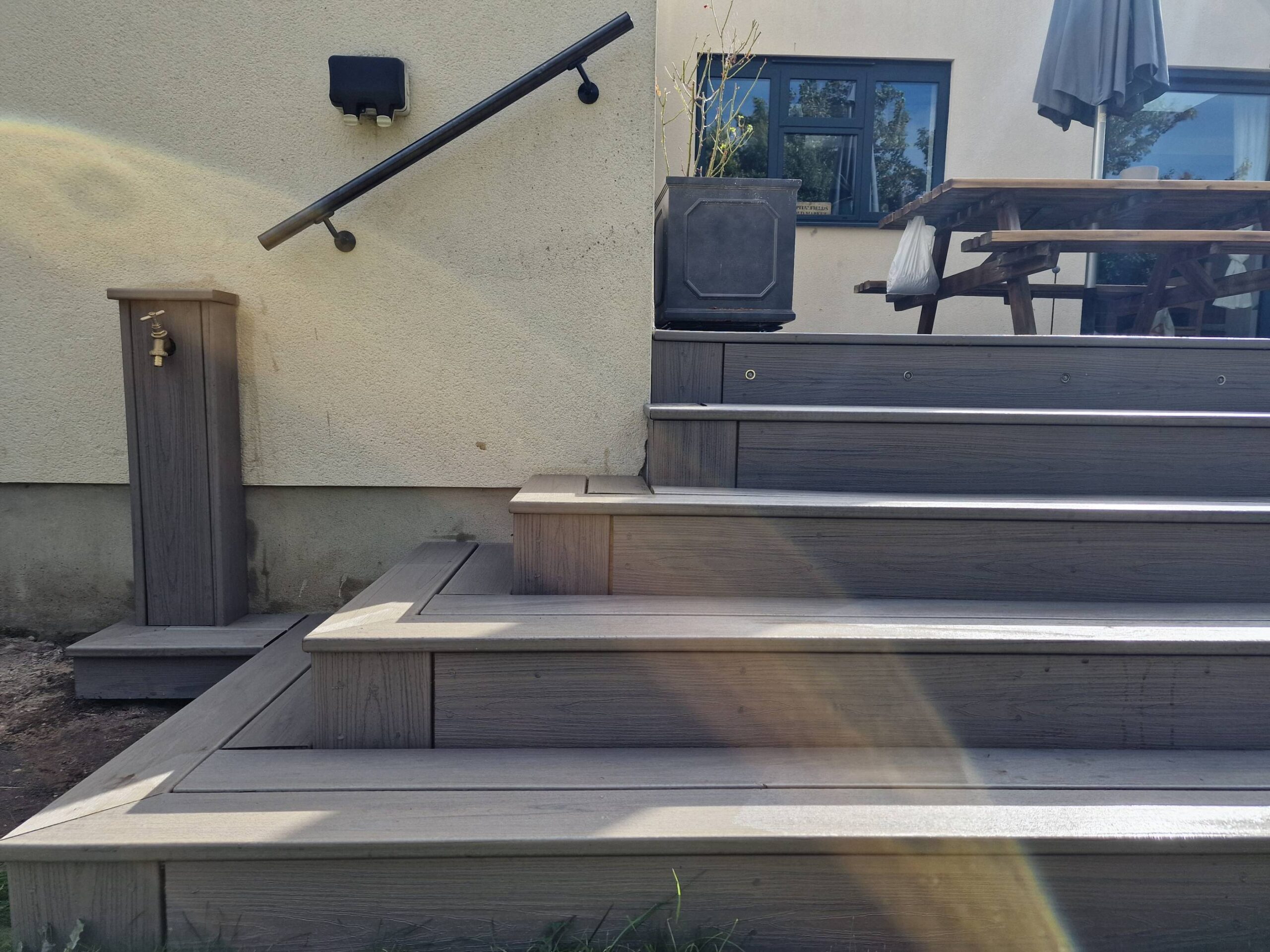 They also wanted a Ballustrade at the other side of the deck, however we proposed a wall mounted Handrail on that side which worked better than taking up valuable space on their decking. Posts for Ballustrades would have pushed the handrail out over the pyramid steps taking away from the overall look.