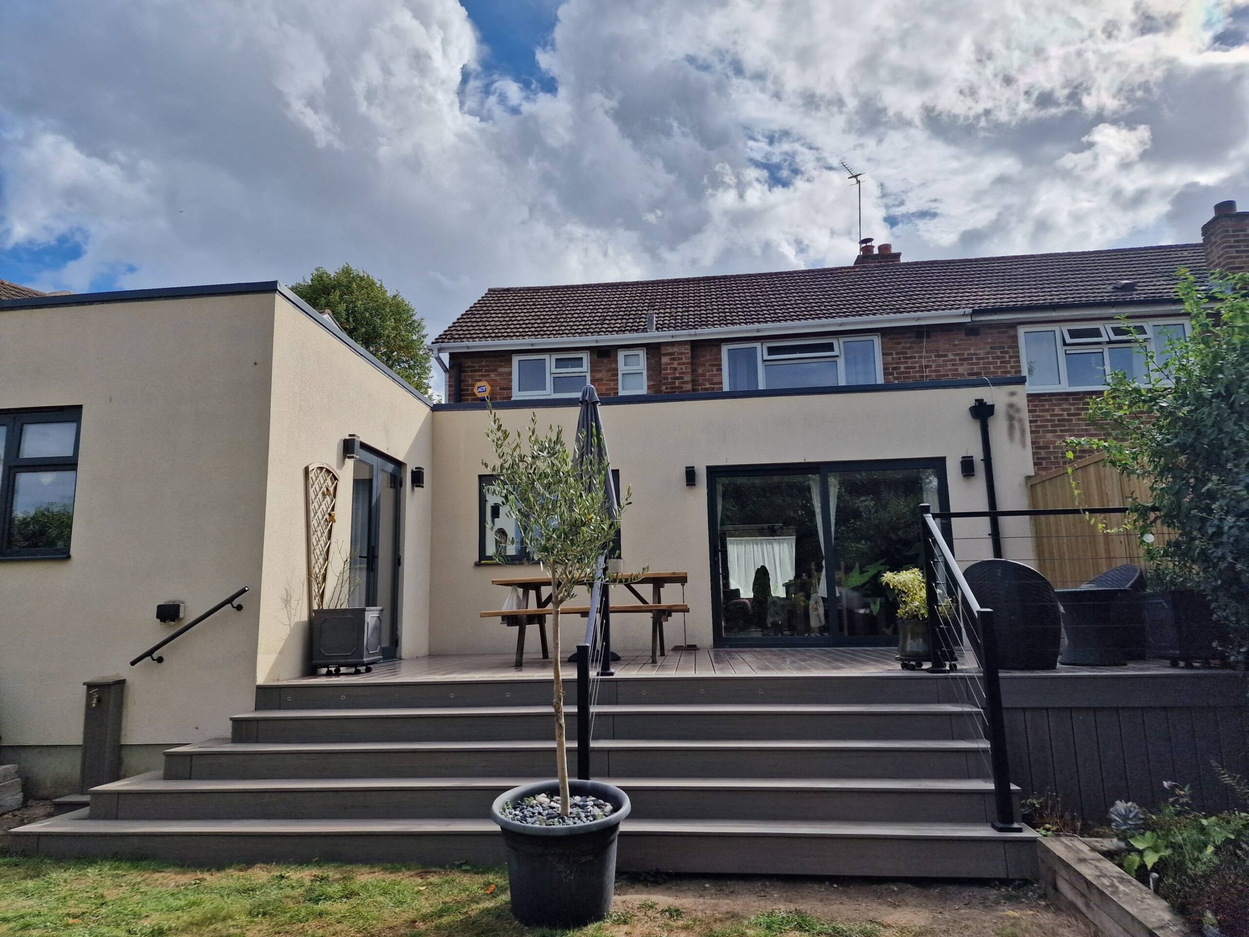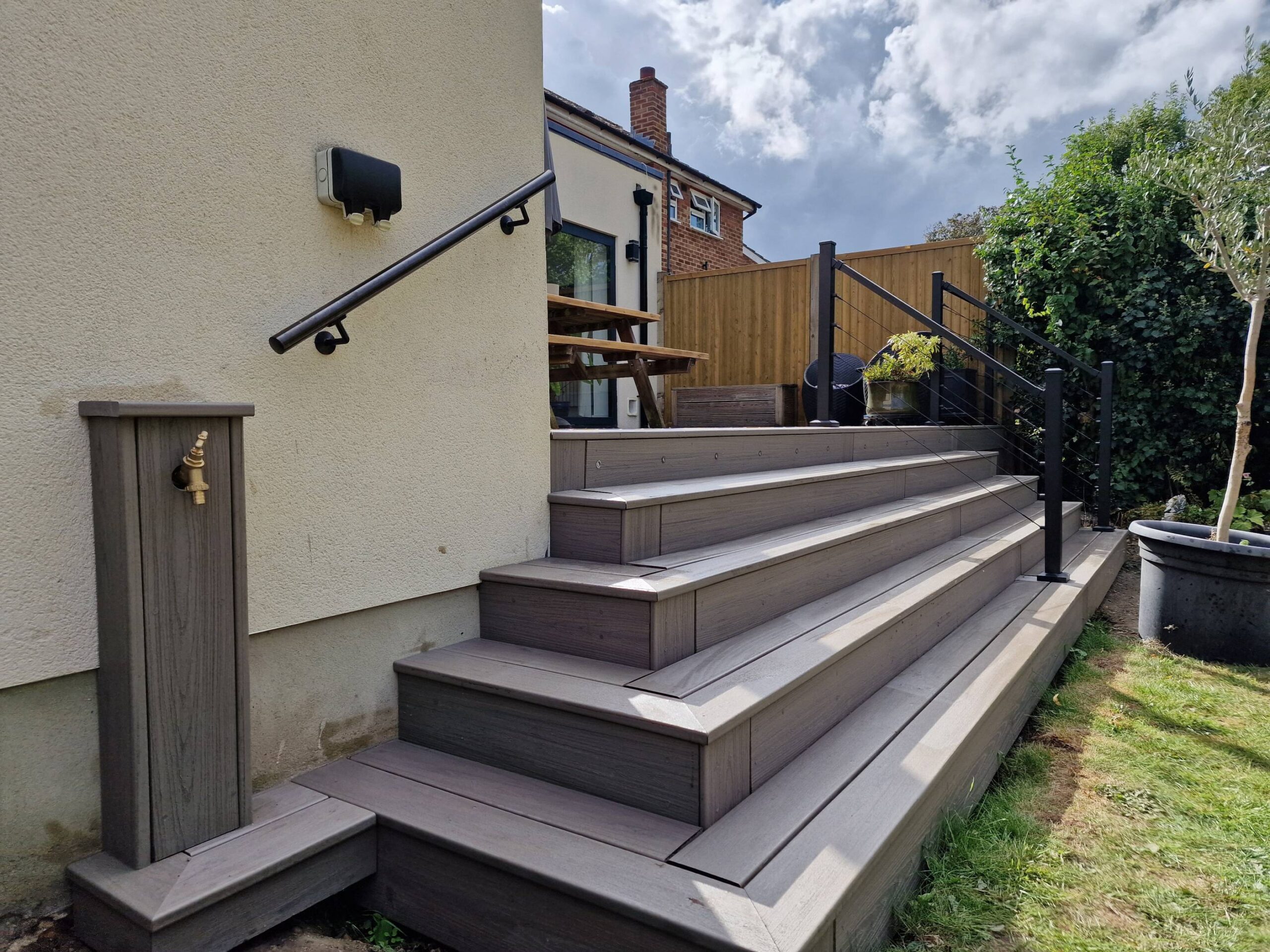 The final result was a beautifully integrated outdoor space that blends seamlessly with the modern home, offering both form and function. The clients were thrilled with the outcome, from the carefully crafted decking design to the stunning pyramid steps and the sleek, low-maintenance finishes. This project not only elevated the aesthetic of the property but also created a durable, long-lasting area for entertaining and relaxation.